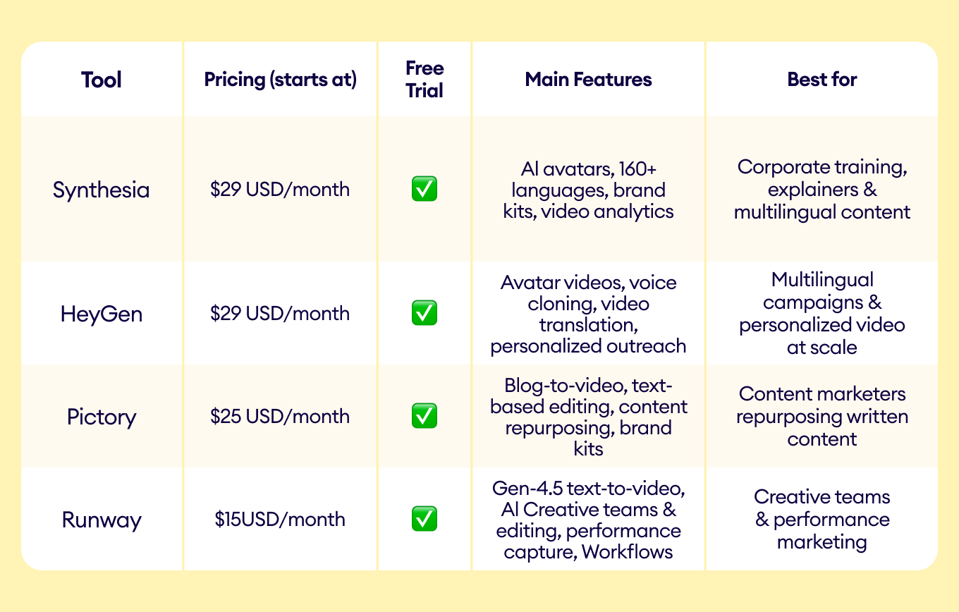 💡 Tip: Synthesia and HeyGen work best for avatar-led videos. Pictory is built for content repurposing. Runway is the stronger choice when visual quality and creative control matter most.