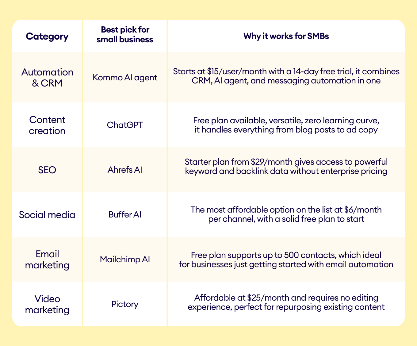 💡 Tip: The smartest starting stack for a small business is: ChatGPT (content) + Google Analytics 4 (analytics) + Mailchimp or ActiveCampaign (email) + Buffer (social) + Kommo (CRM & automation). That gives you a fully functional AI marketing operation for well under $100/month, and most of it is free to start.