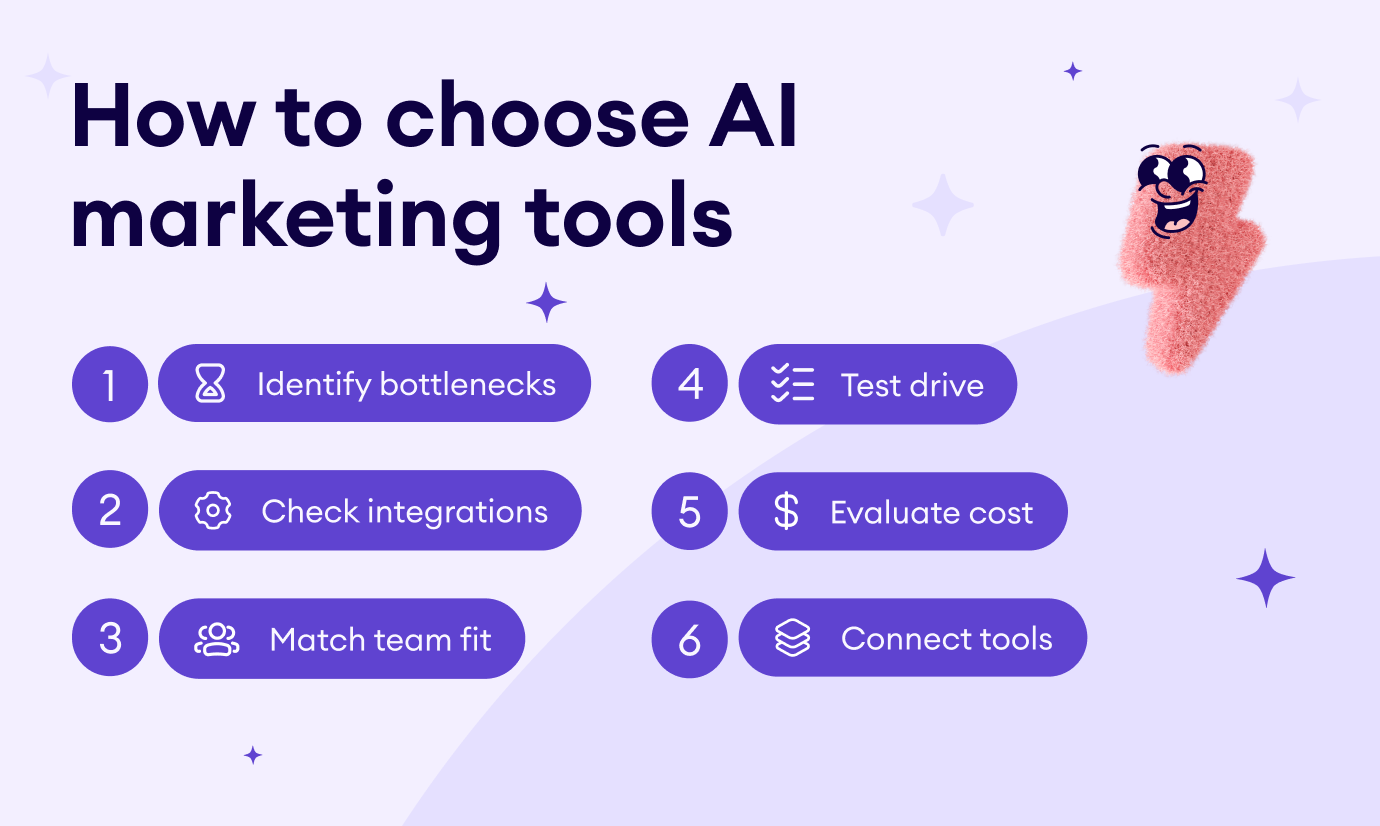 With hundreds of AI tools for marketing available in 2026, choosing the right ones comes down to clarity about your goals, your team's capabilities, and your existing tech stack. Here's a practical framework to help you decide: