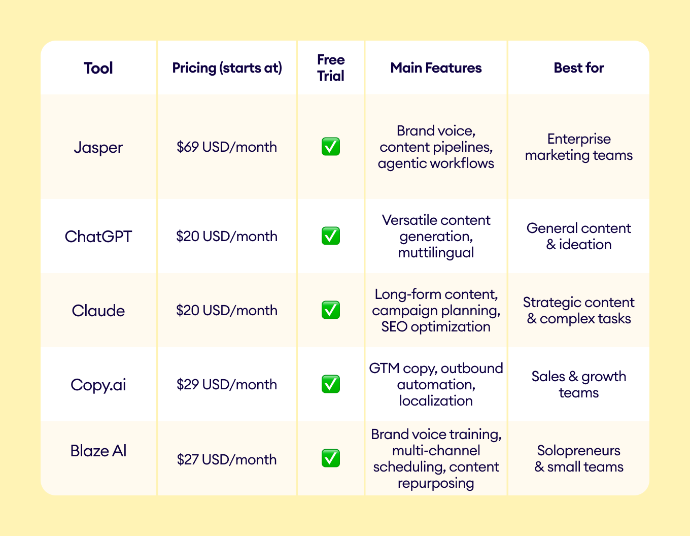Running marketing for a small business means doing more with less: less budget, less headcount, and less time. The good news is that most of the best AI marketing tools covered in this guide offer accessible pricing tiers, short learning curves, and enough firepower to compete with teams ten times your size. Here are the top picks from each category, chosen specifically for small businesses based on ease of use, value for money, and real impact.