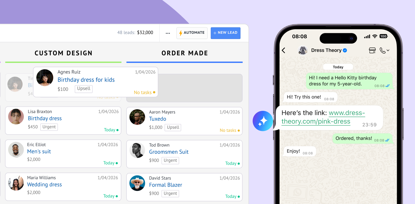 Kommo is a messenger-based CRM built to take that weight off your team, automating conversations, qualifying leads, and moving deals through your pipeline from a single platform. At the center of it all is its AI agent: a no-code, 24/7 virtual assistant that engages prospects across WhatsApp, Instagram, TikTok, Facebook Messenger, live chat, and more, without anyone on your team having to lift a finger.