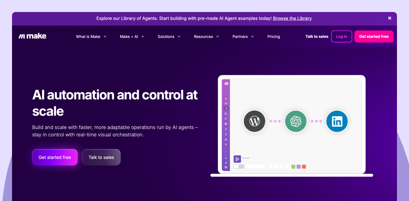 - Orchestrate AI agents using Make AI Agents, connecting models like OpenAI and Claude into automated multi-step workflows.