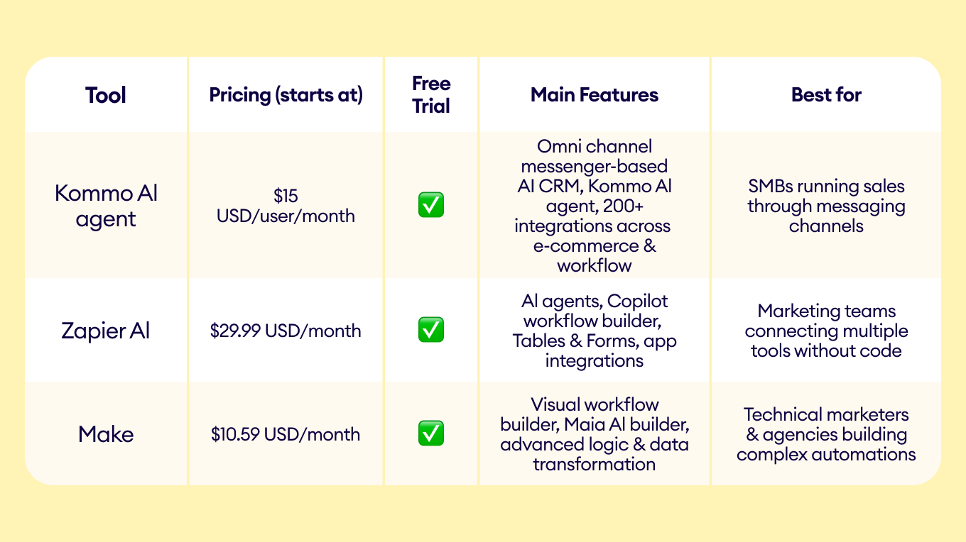 💡 Tip: Each tool solves a different problem. Kommo is ideal when you need AI, CRM, and messaging in one place. Zapier connects your existing tools with ease. Make handles complex logic and high-volume flows.