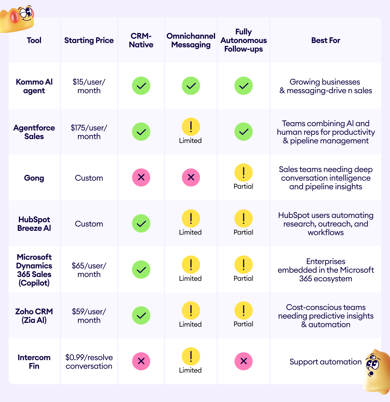 This table compares key AI sales agents, their pricing, and capabilities. Kommo AI agent stands out as a CRM-native, omnichannel, fully autonomous solution, making it ideal for teams looking to effortlessly turn conversations into sales.