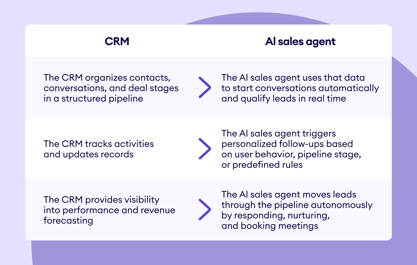 A CRM is the foundation of your sales operation. It stores contact data, tracks deal stages, and centralizes pipeline visibility. An AI sales agent builds on that foundation by leveraging data in your CRM to automate real-time actions.