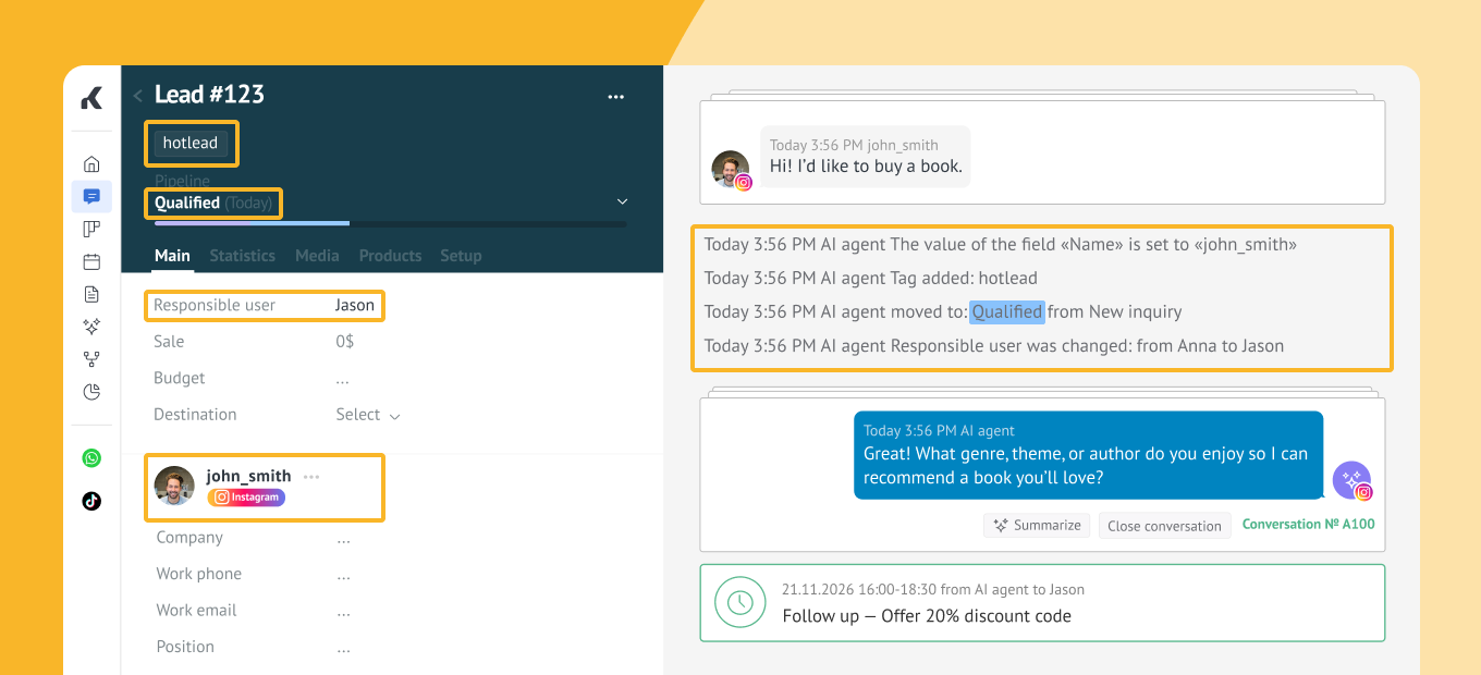 As conversations unfold, Kommo AI agent updates the lead card with key details from the chat, moves the deal through the pipeline, and automatically creates tasks for the right team member.