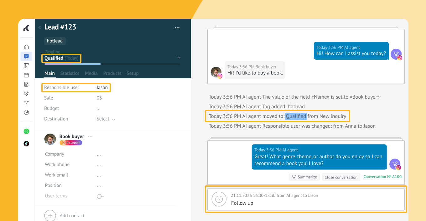 Kommo’s no-code AI agent allows you to automate customer conversations, qualify leads, schedule meetings, and even personalize e-commerce interactions — all without switching between apps.