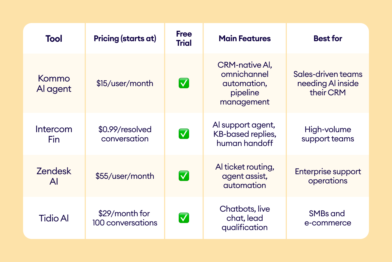 Comparison table: AI tools for customer service, support & sales