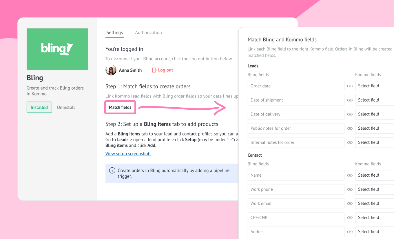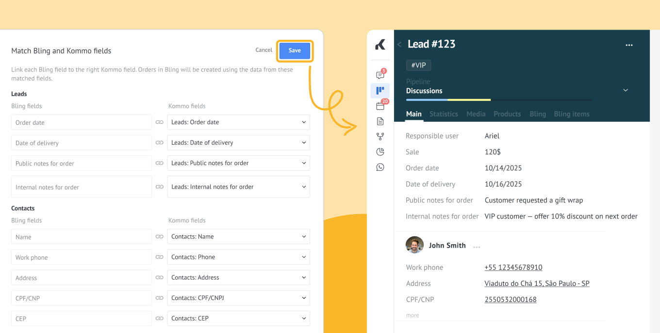 The integration allows you to match Kommo lead and contact fields with corresponding Bling fields. This ensures every order created in Kommo includes the correct customer and product details in Bling.