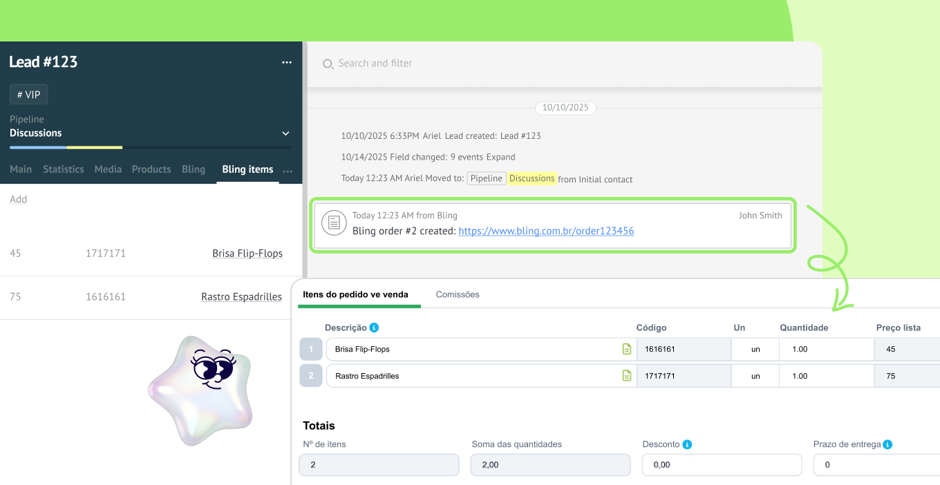 From any lead card, you can generate an order in Bling using the Bling tab. Order details, such as ID, item quantity, total cost, and order status, appear in Kommo instantly, with a direct link to view or edit the order in Bling.