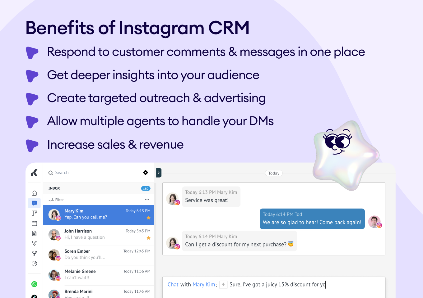 An Instagram CRM lets you capture and manage conversations from Instagram direct, stories, and comments.