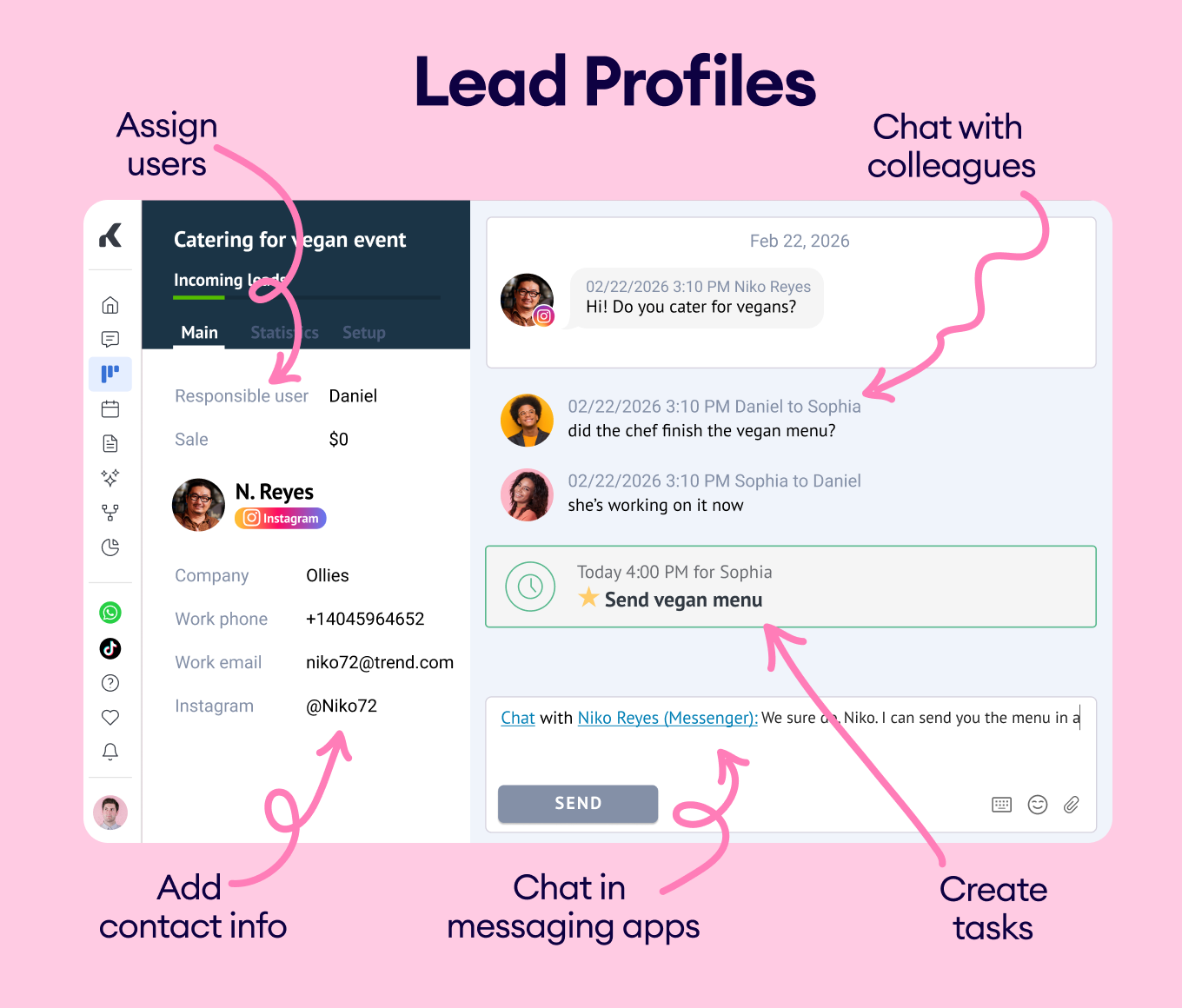 You can chat with colleagues, set tasks, and create reminders directly within Kommo’s lead card, streamlining your workflow and ensuring that everything and everyone is taken care of. 😎