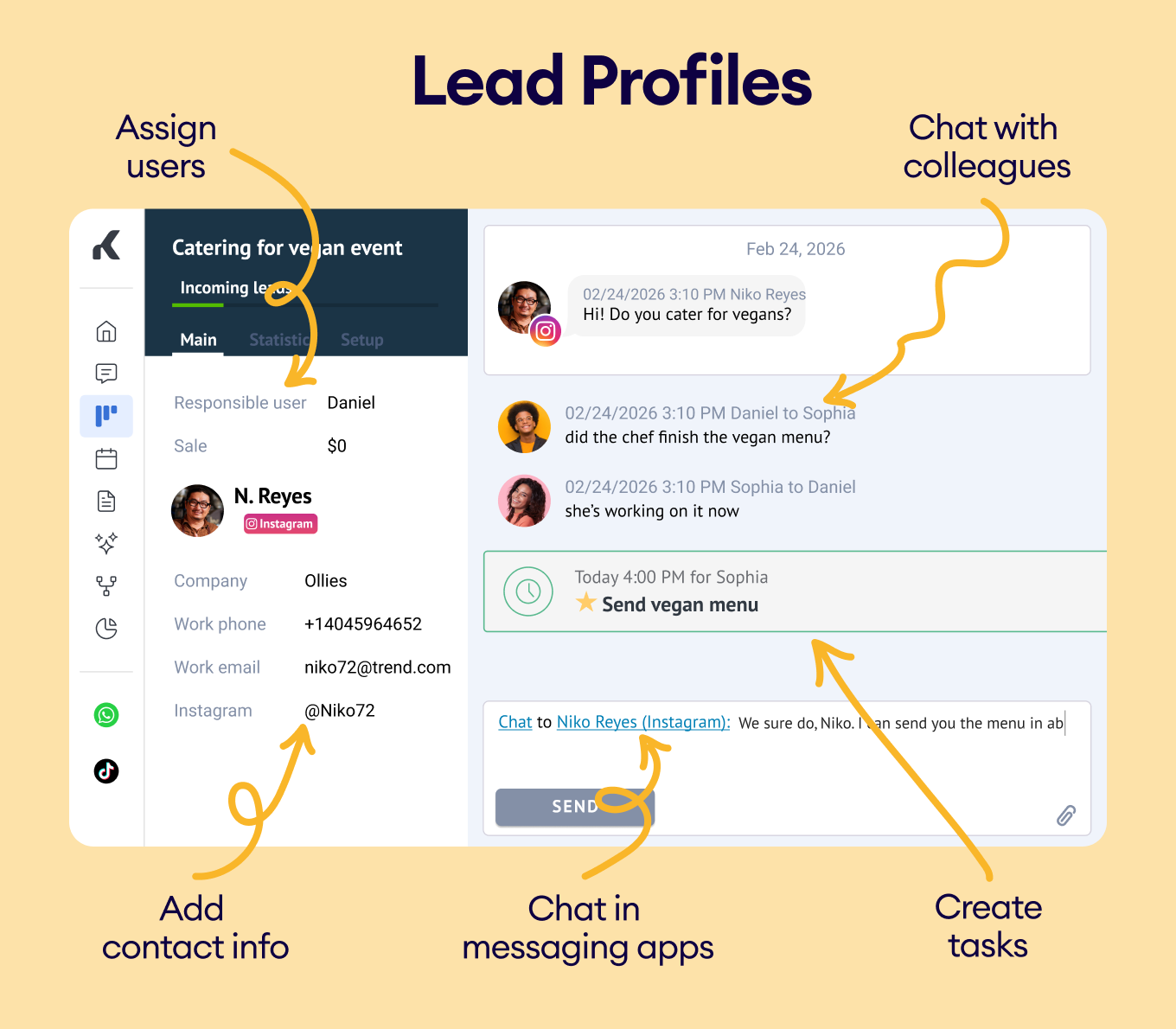 When an Instagram lead sends you a message, leaves a comment or mentions you on their story, Kommo automatically generates a lead card (lead profile). This lead card contains contact details, complete history of interactions, notes, and tags. It equips your sales team with the necessary information, providing personalized and well-informed follow-ups with your leads.