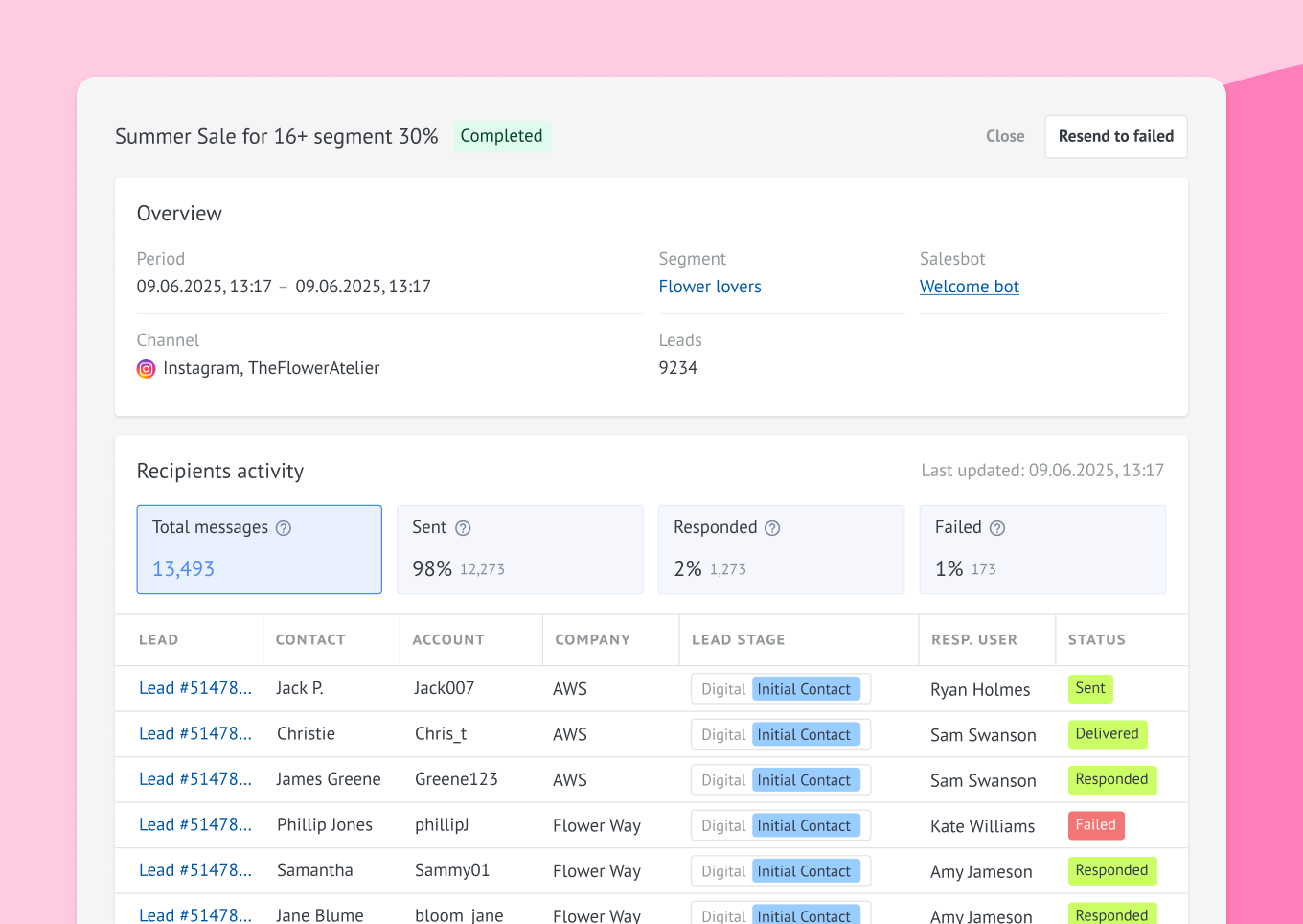 Broadcast to precise segments with rule-based targeting and zero duplicates. Automate follow-ups with a Salesbot to qualify leads or guide purchases.