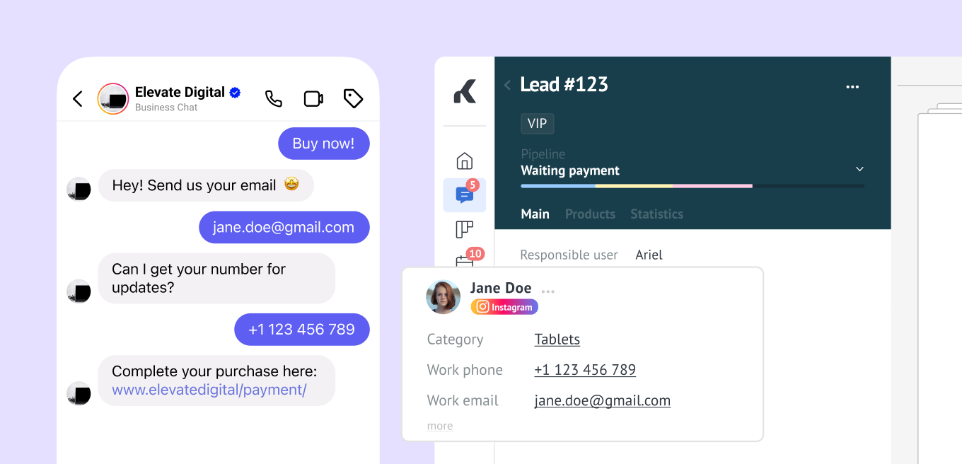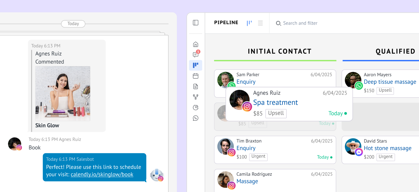 Every new message from Instagram automatically creates or updates a lead card in your CRM, capturing their profile and history.