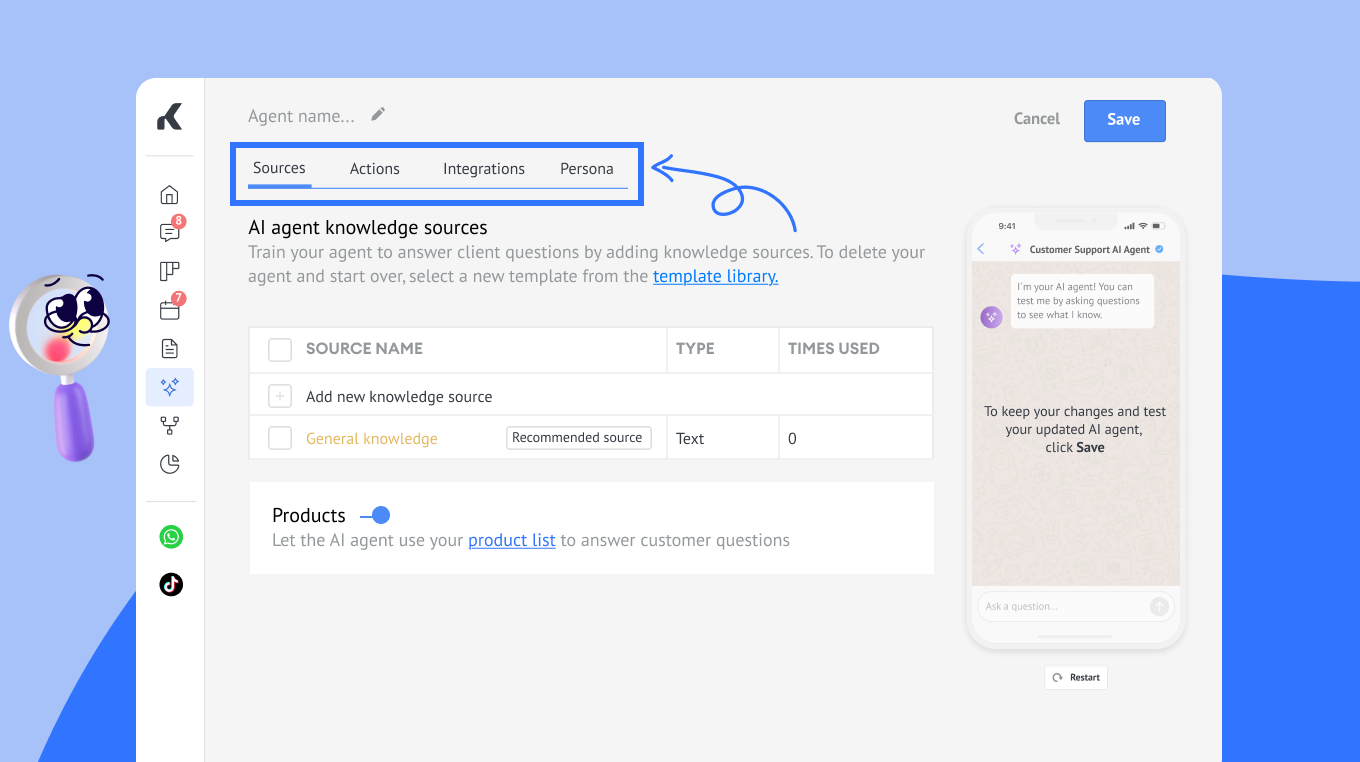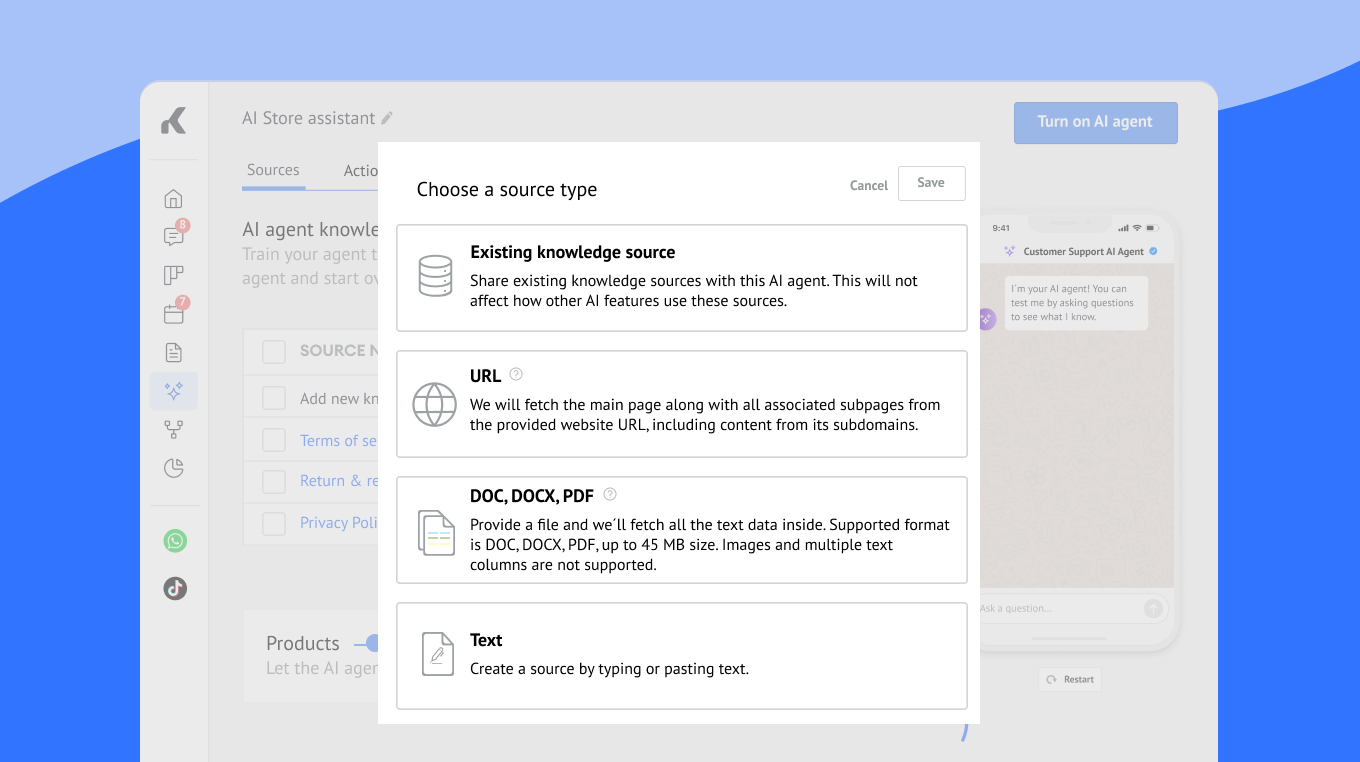 This is exactly how Kommo’s AI agent works. All you need to do is feed it with knowledge sources and customize its personality to suit your brand, and leave the rest to the agent!