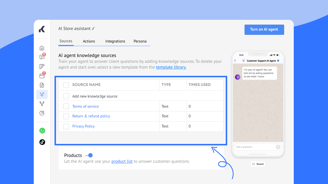 💡Tip: For best results, ensure the product info in Kommo is complete and your key policy docs are connected in the AI settings.