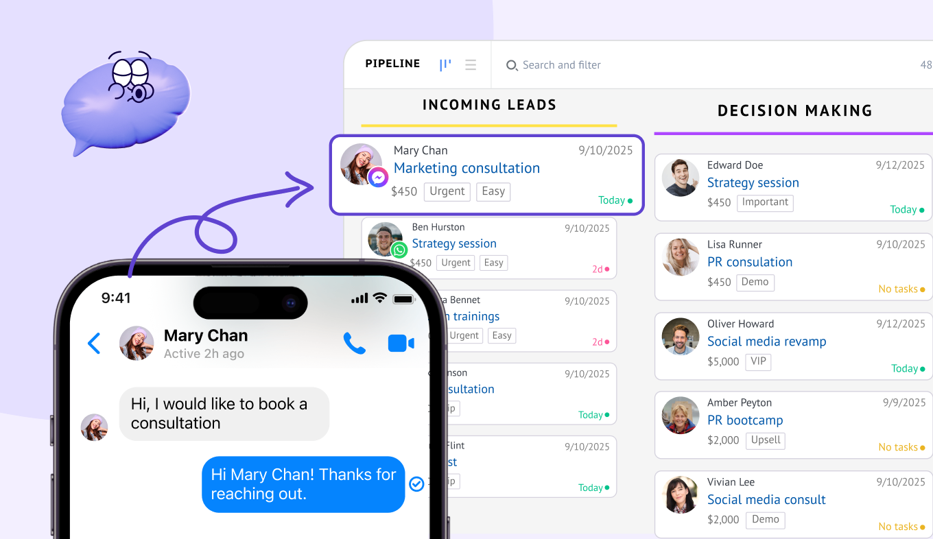 With Kommo, every new message on your Facebook Business Page instantly becomes a lead in your sales pipeline - ensuring no opportunity is missed and your team can respond right away.
