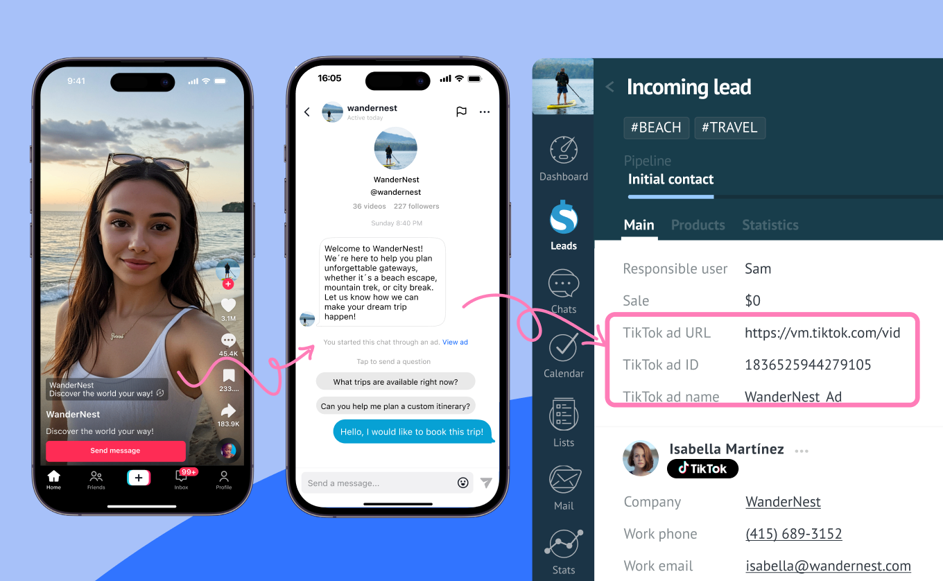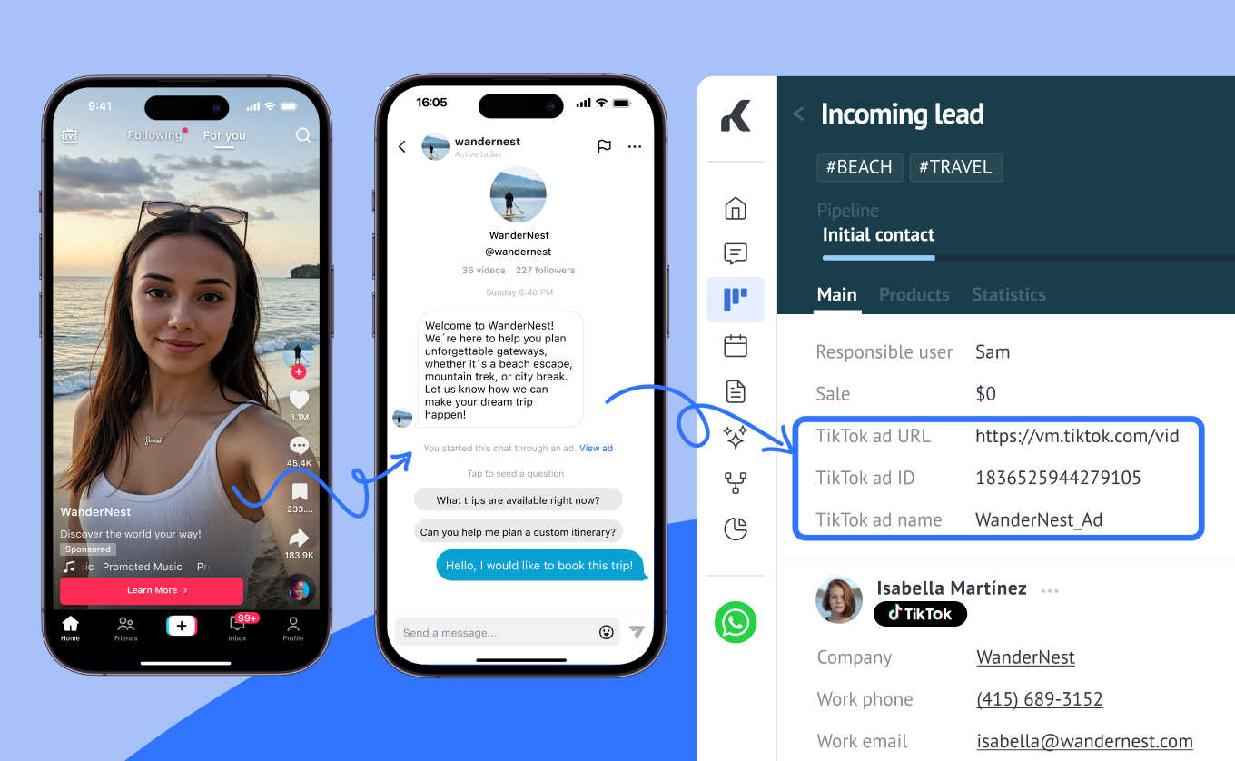 Kommo is one of the world’s very first CRM platforms to seamlessly integrate TikTok Business Messaging and lead generation so that you can turn every interaction into a sales opportunity.