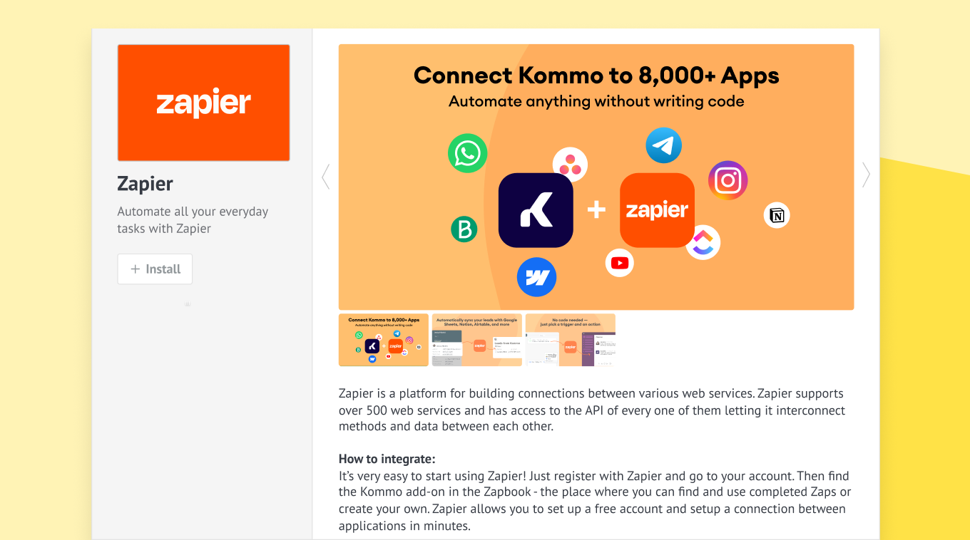 Kommo’s Zapier integration connects your CRM with over 2,000 apps, making automation simple and code-free. From capturing leads and managing tasks to handling documents and processing payments, Zapier streamlines your workflows by automating repetitive tasks, reducing errors, and ensuring your data stays synced across all tools.
