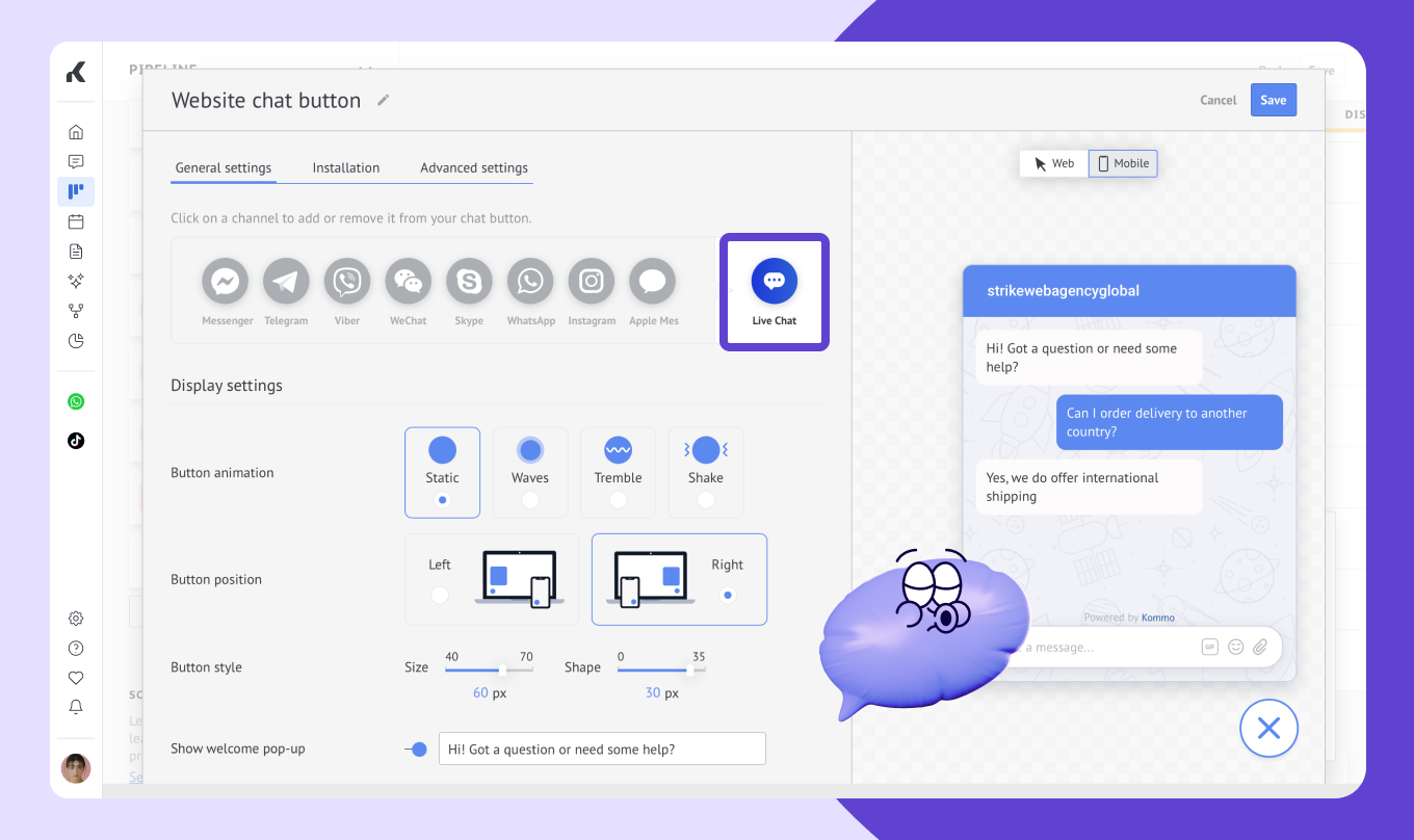 Customize appearance: Choose the chat widget’s design and set up welcome messages.