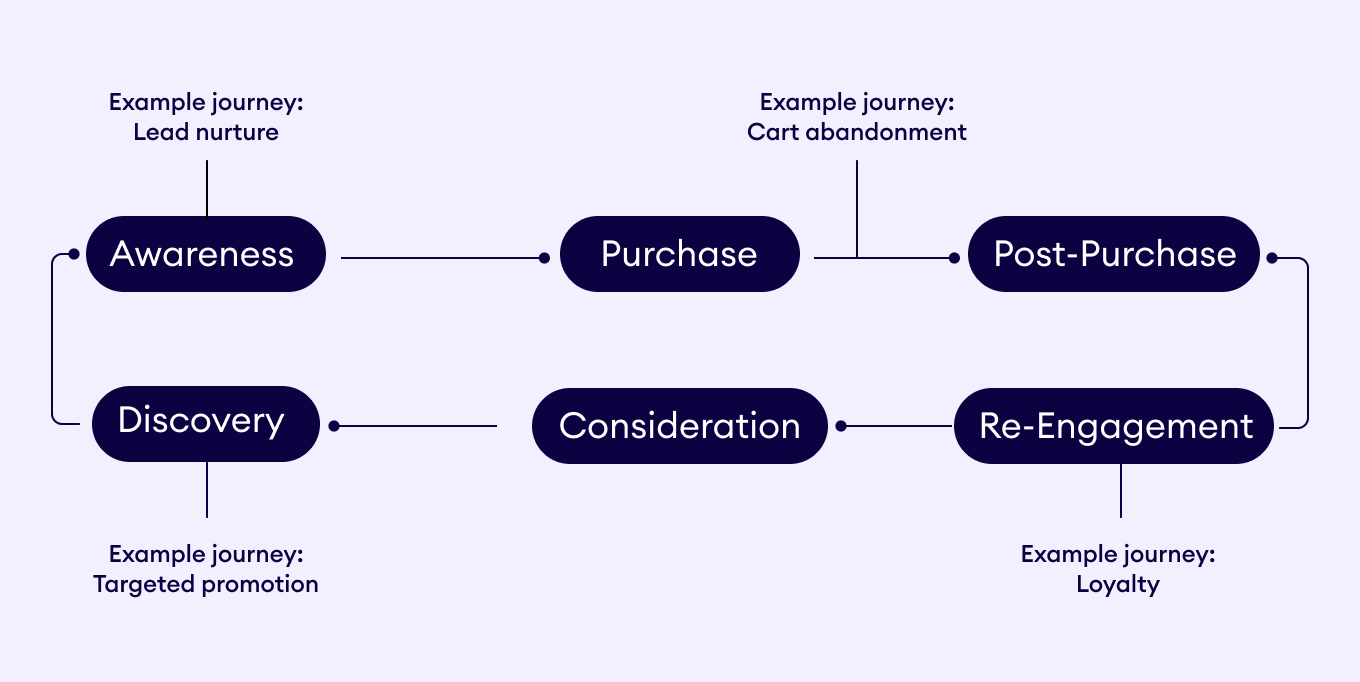 Understand the customer journey as a continuous loop, not a linear path. This model shows key stages from Discovery to Post-Purchase and Re-Engagement, highlighting opportunities to connect with targeted marketing messages at every step.