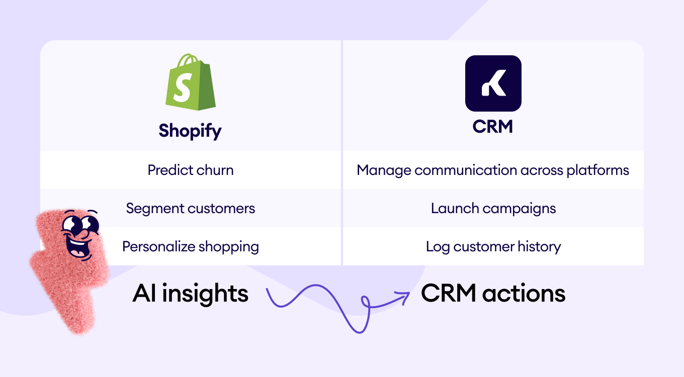 Shopify AI tells you what is happening (e.g., “This customer is likely to churn”). A CRM enables you to do something about it (e.g., trigger a personalized re-engagement campaign and track its success).
