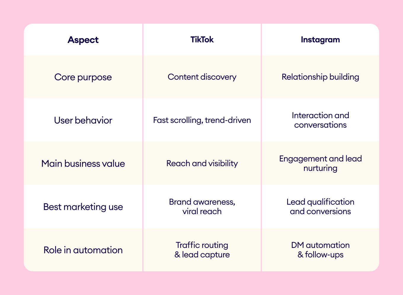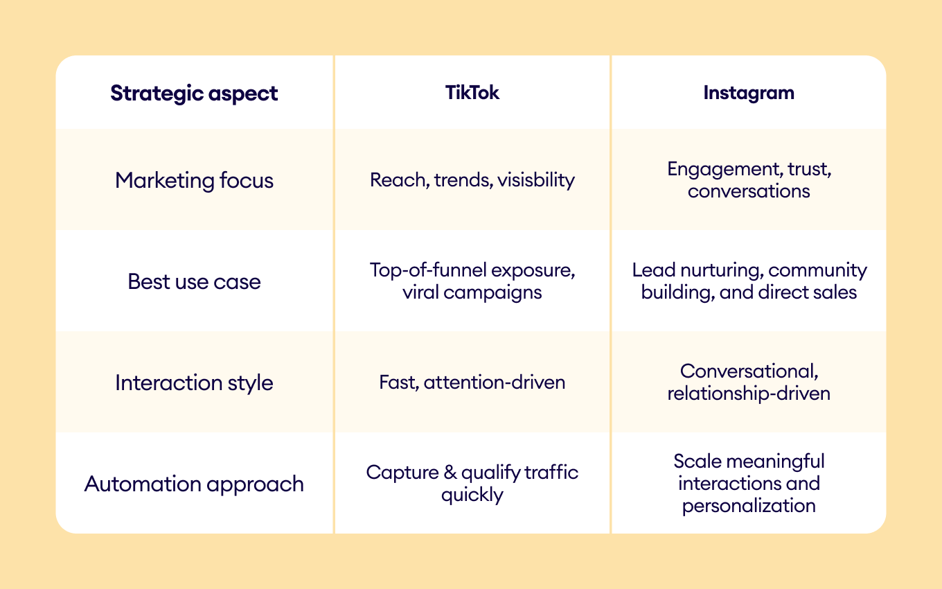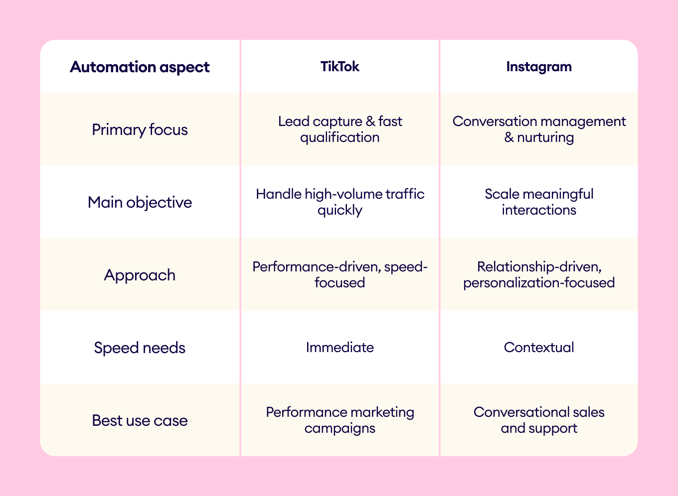 Both platforms allow the same automations, but TikTok prioritizes speed and lead capture from high-volume traffic, while Instagram focuses on managing interactions and nurturing relationships at scale.