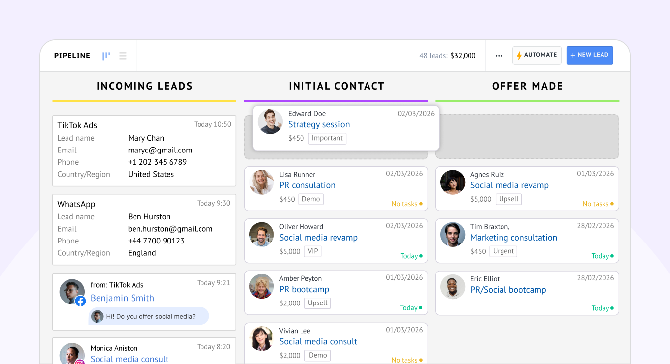 Leads from TikTok and Instagram ads, forms, and links are automatically captured, tagged by source, and routed correctly.