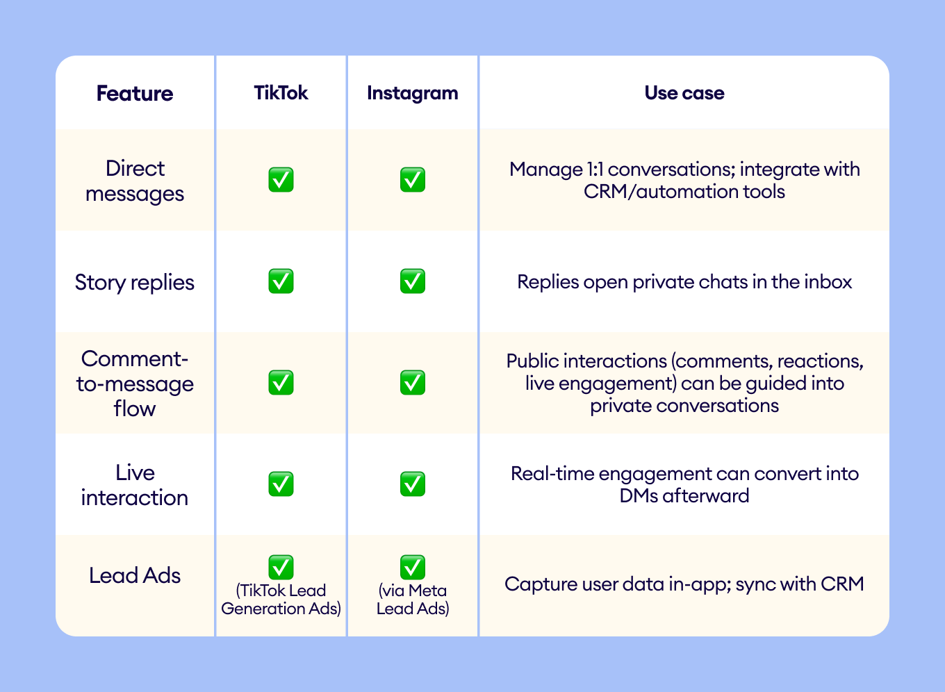 💡 Tip: On TikTok, not every interaction starts as a DM. Brands that treat comments, likes, and ad leads as part of their engagement strategy extract far more value from their content.