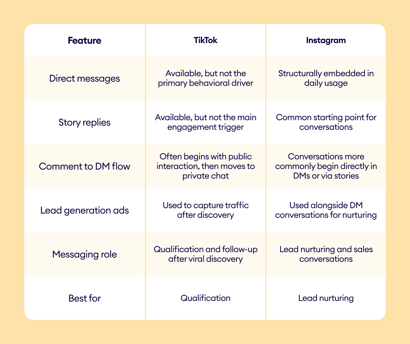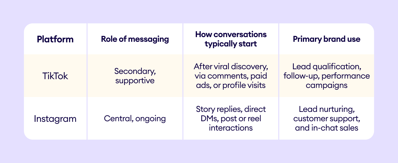 Because of their design, TikTok and Instagram drive very different user behaviors, which directly shape how businesses should approach messaging and automation.