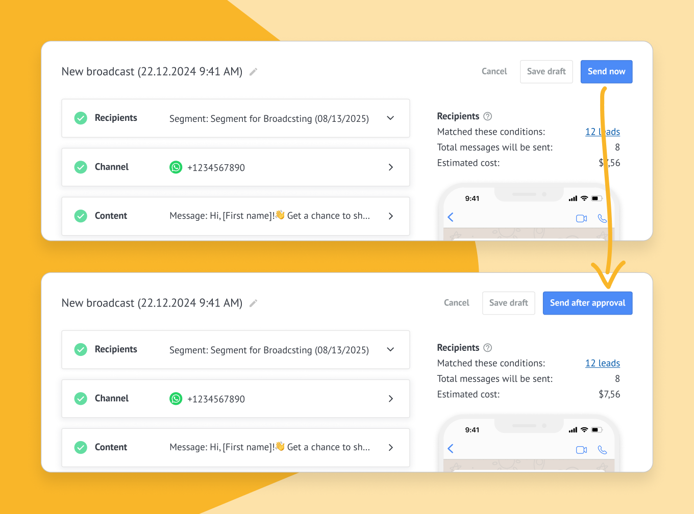 💡Tip: If you've created a new WhatsApp template, we recommend using the “Send after approval” option. This way, Kommo will automatically send your broadcast as soon as it is approved by Meta.