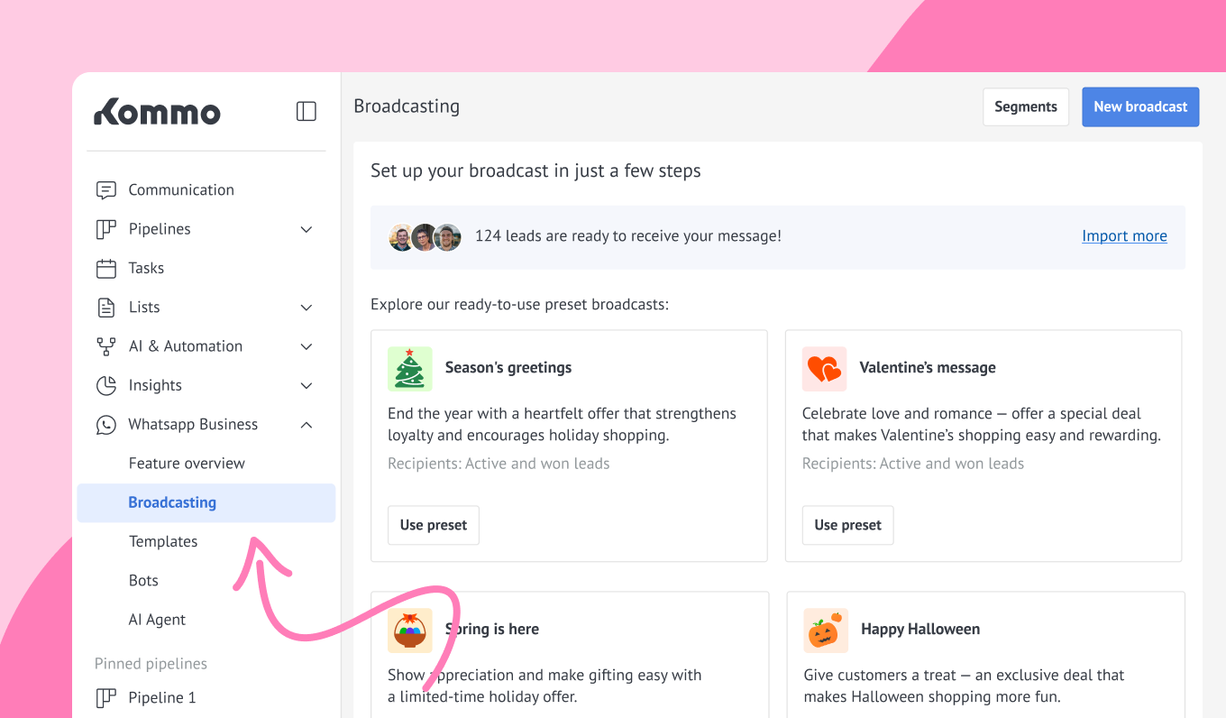To set up your WhatsApp broadcast in Kommo, follow these steps: