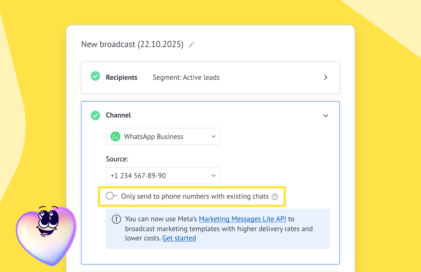 With the “Only send to phone numbers with existing chats” option, you can decide who receives your messages: all numbers in your database (new and existing) or only customers you’ve interacted with before.