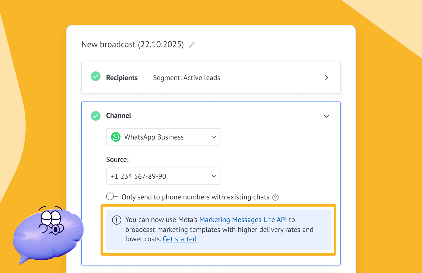 Kommo now supports Meta’s latest MM Lite API for WhatsApp broadcasts using marketing templates. This optimized channel improves deliverability, speeds up onboarding, and unlocks richer statistics for your WhatsApp broadcast campaigns.