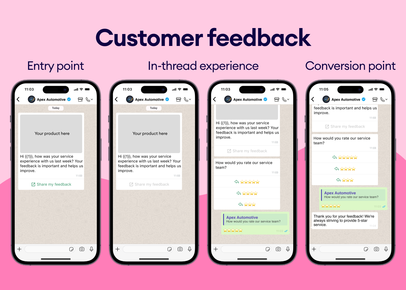 Collect instant feedback directly in WhatsApp. Send an automated request after service or purchase with quick-rating buttons to effortlessly boost review collection.