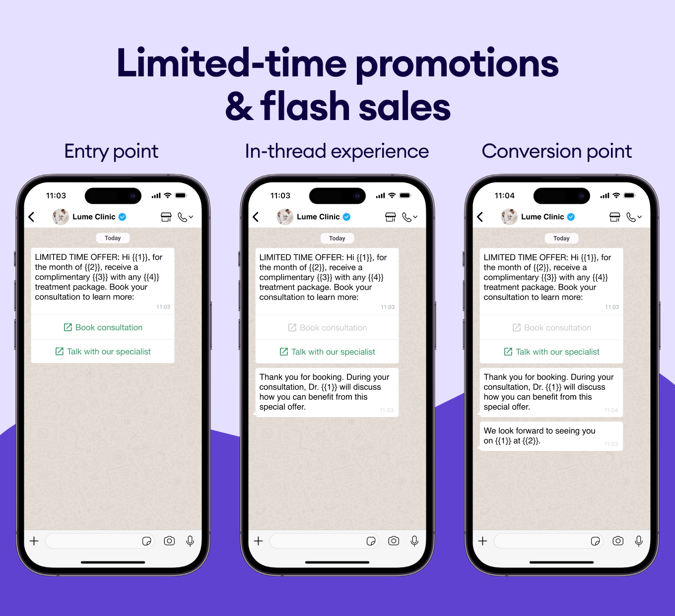 Notify clients via WhatsApp messages when high-demand services or offers are back, to ensure they secure their booking.
