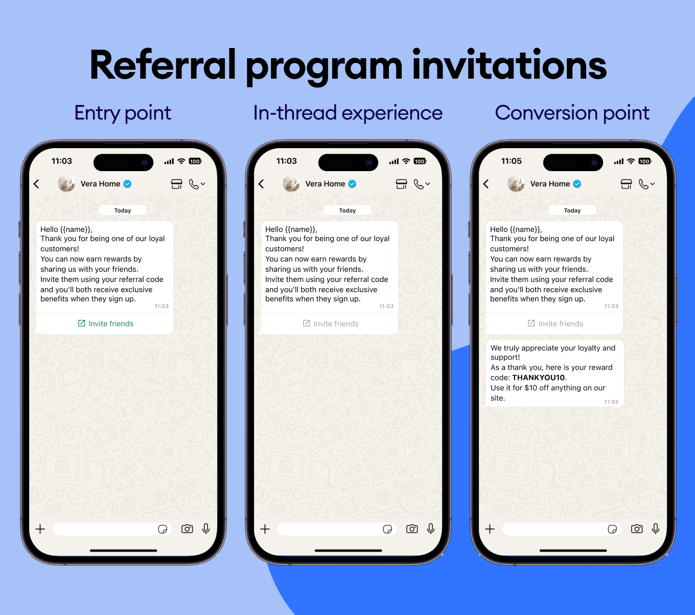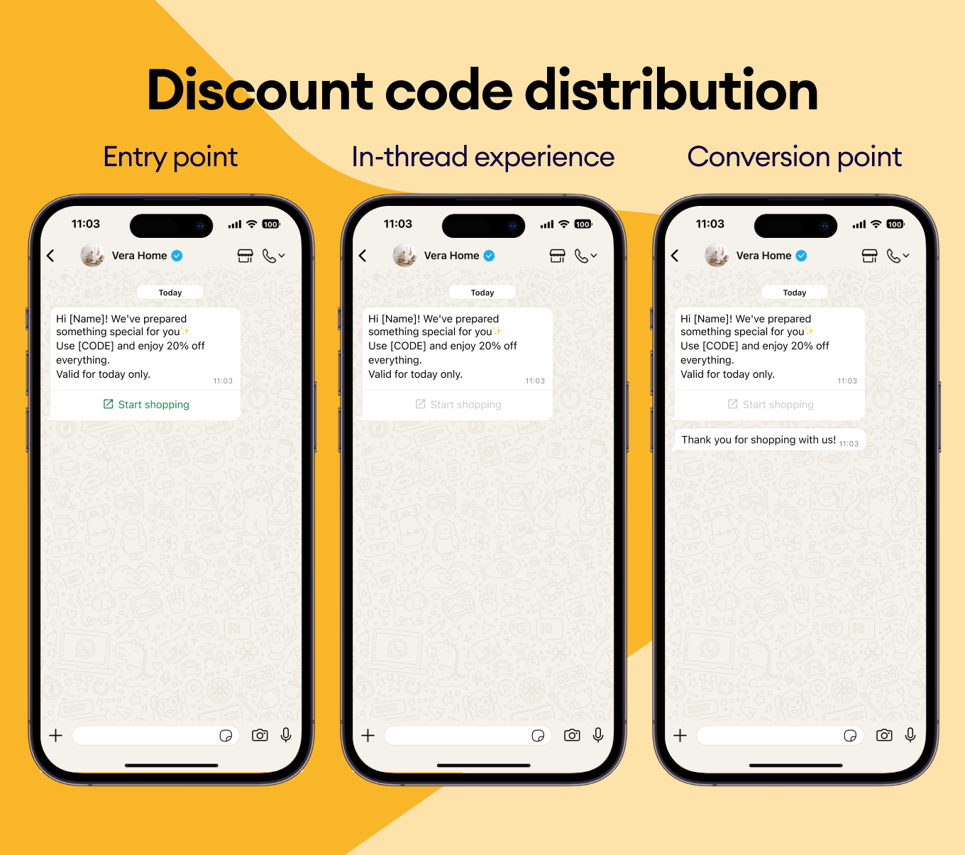 Share promo codes and discounts that feel personal, and your customers will want to use — right in their WhatsApp chat.