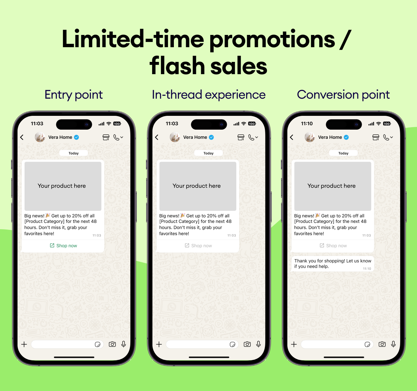 Send urgent offers with “Shop Now” buttons directly to customers' chats to capture revenue before the clock runs out.