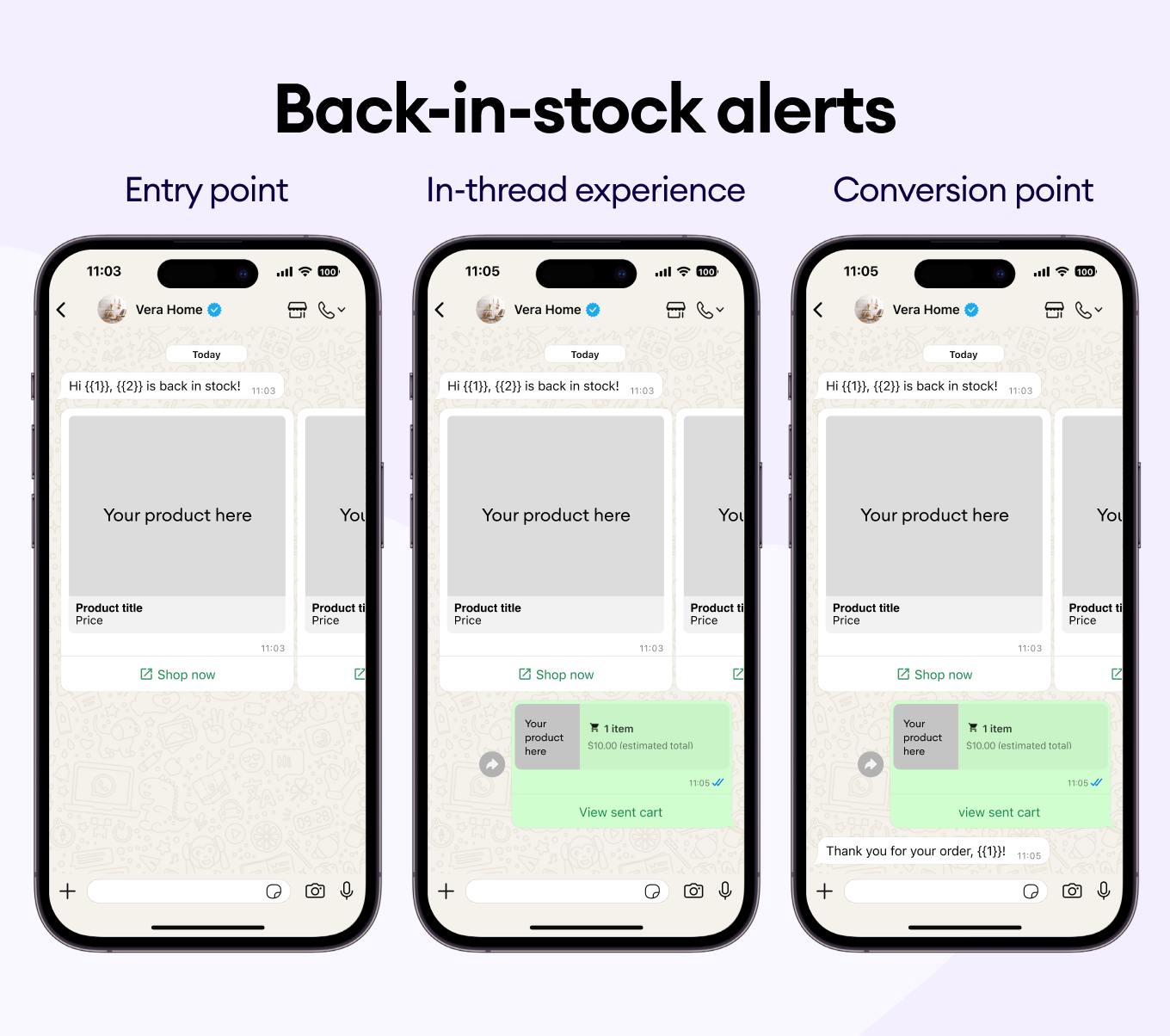 Send customers a heads-up with a simple WhatsApp message template when their favourite item is back in stock, so they can grab it before it’s gone again.