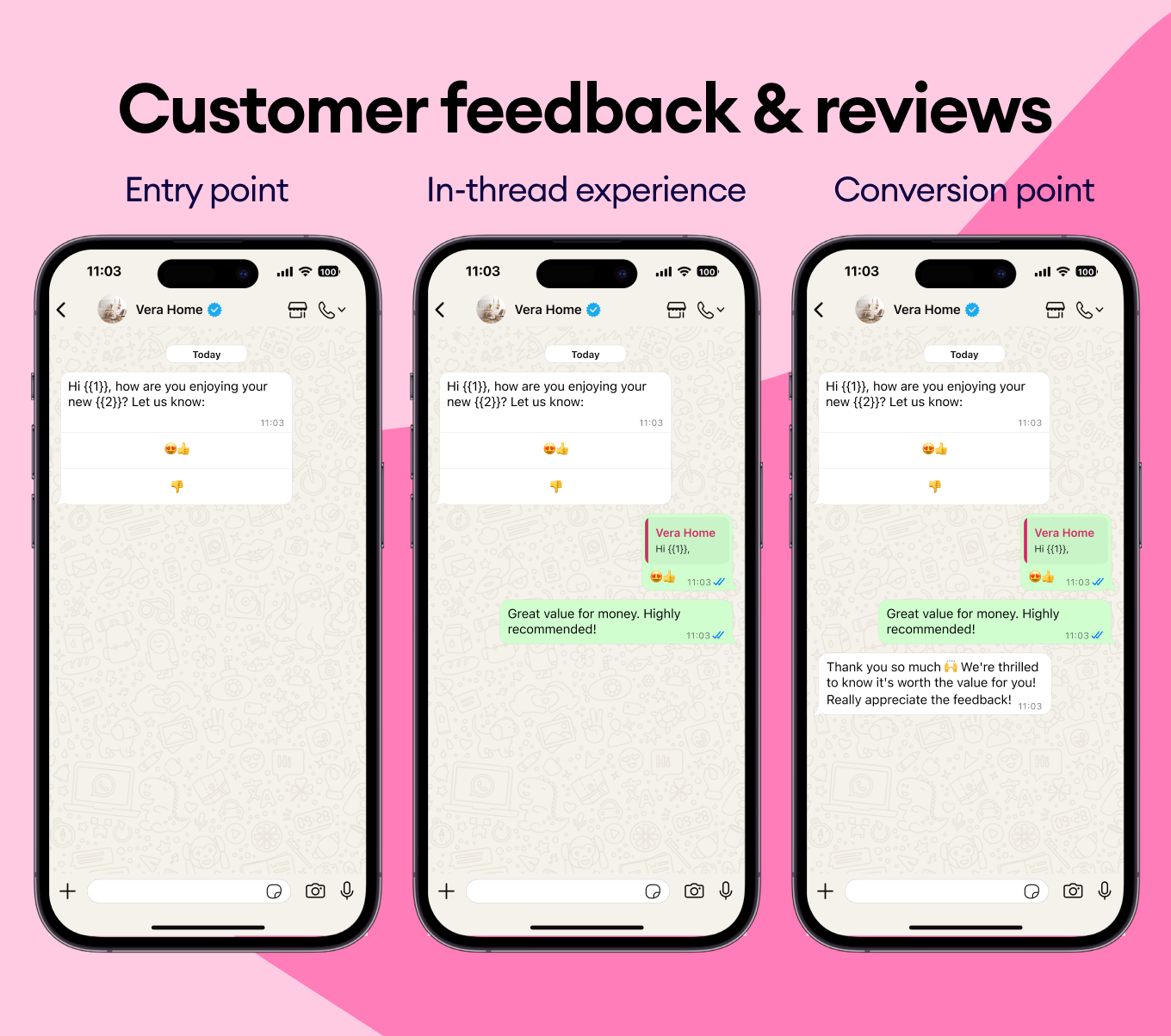 Capture customer feedback with one-tap WhatsApp template messages that your customers are more likely to submit, by reaching out shortly after delivery when the product experience is still fresh.