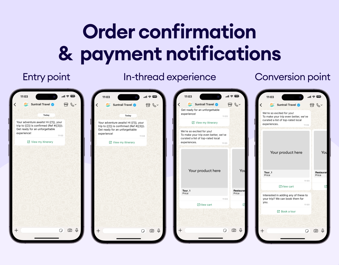 Send instant confirmation with all the important travel details like flight times, hotel names, and booking references straight to your customer’s WhatsApp.
