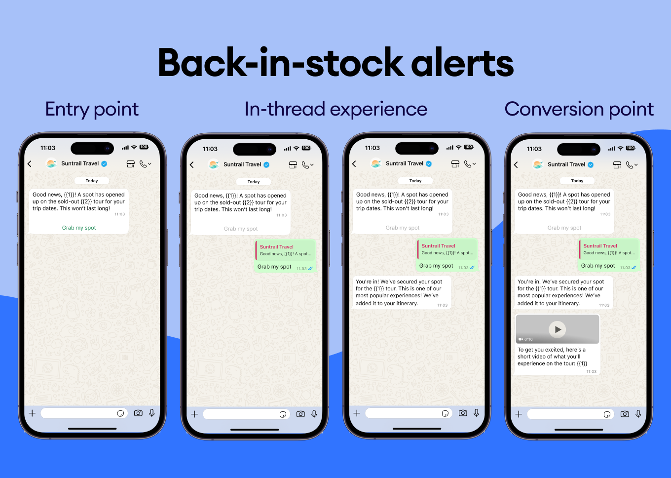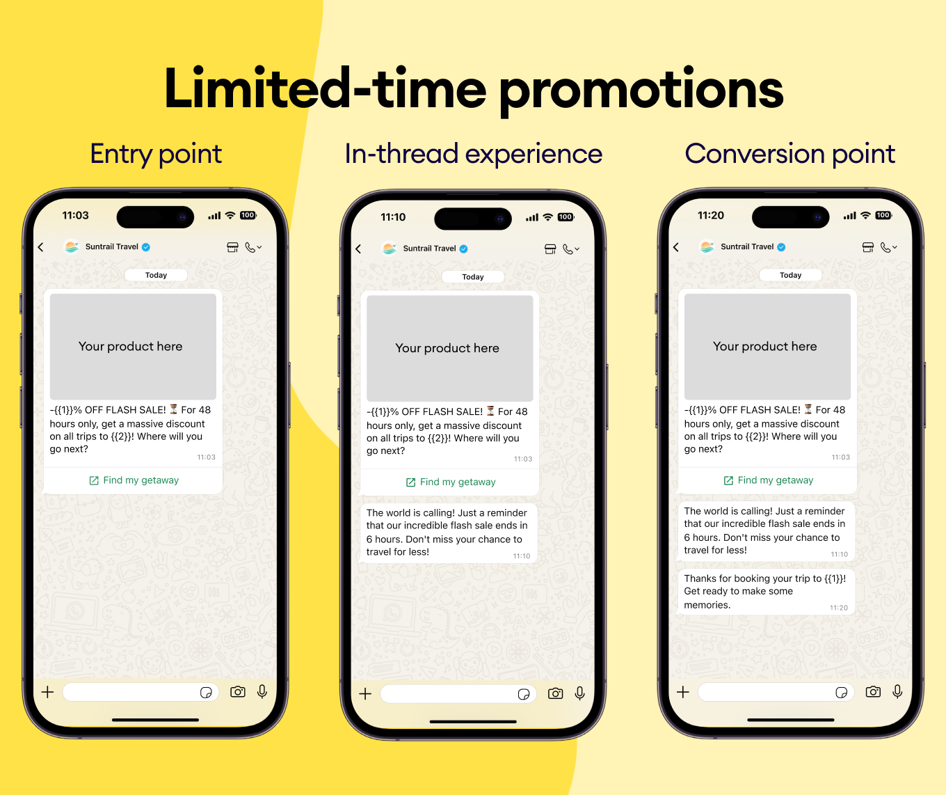 Last-minute deals, or “we have two spots left” urgency messages — send them straight to their WhatsApp chat with “Grab This Deal” buttons to encourage bookings.