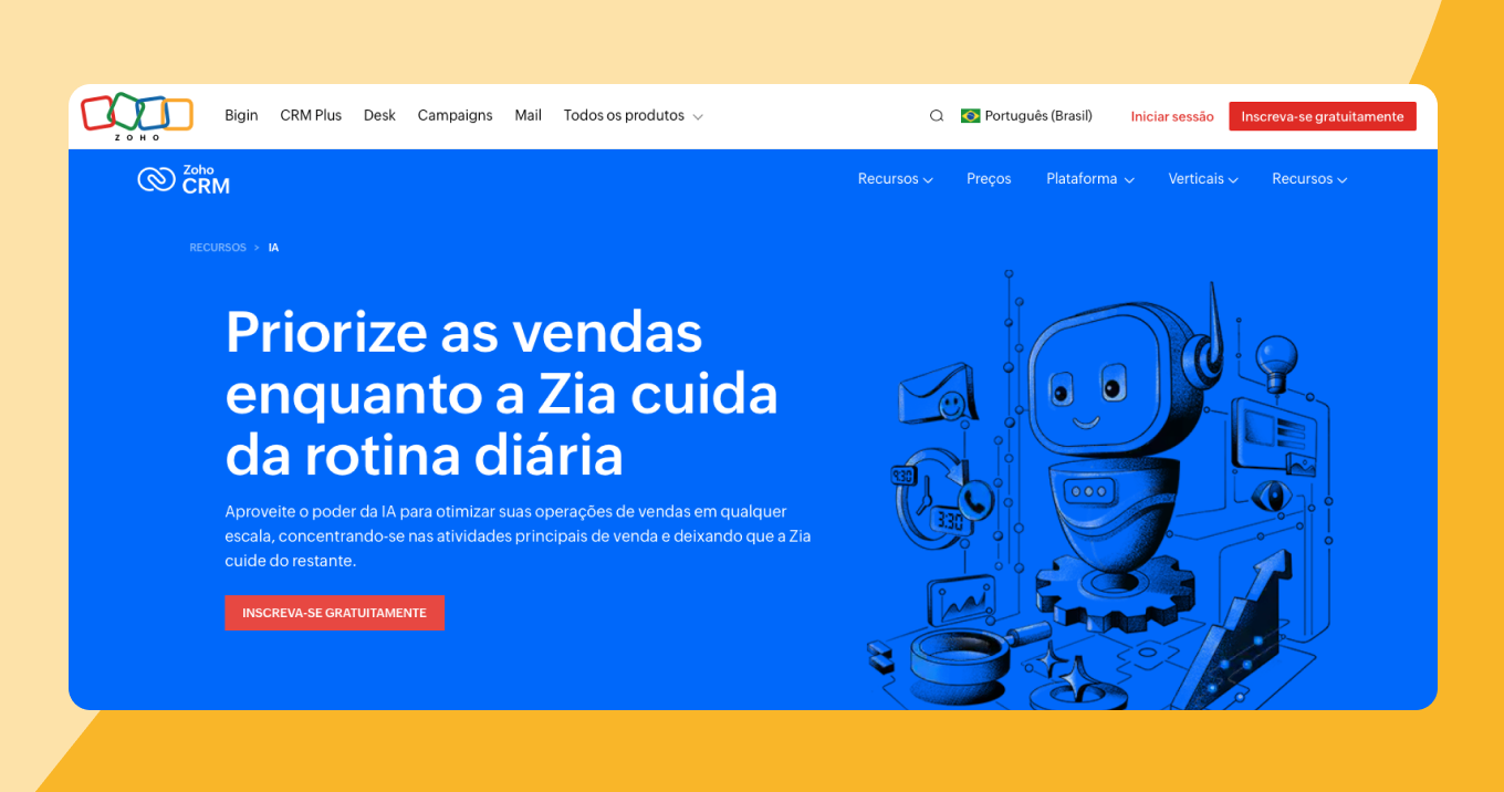 O Zoho CRM integra o Zia, um assistente de IA que analisa dados e automatiza tarefas de vendas.