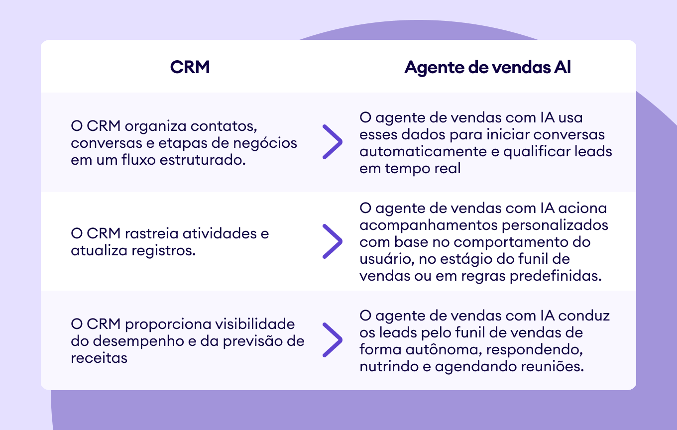 Um agente de vendas com IA é um sistema conversacional e autônomo que interage com seus leads, os qualifica, realiza o acompanhamento automaticamente e conduz os negócios adiante sem a necessidade de intervenção humana constante. Em vez de apenas armazenar dados de contato como um CRM tradicional, ele ajuda você ativamente a vender.