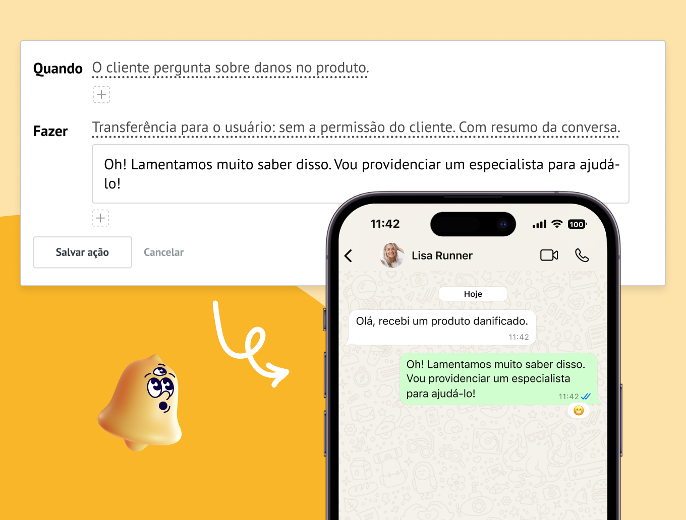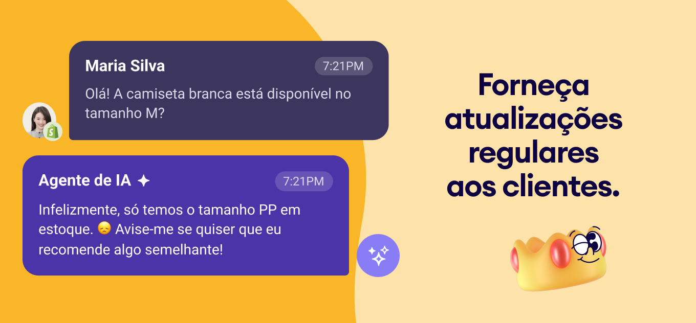 Automação do suporte ao cliente: Responda às perguntas frequentes, compartilhe atualizações de pedidos e sugira produtos.