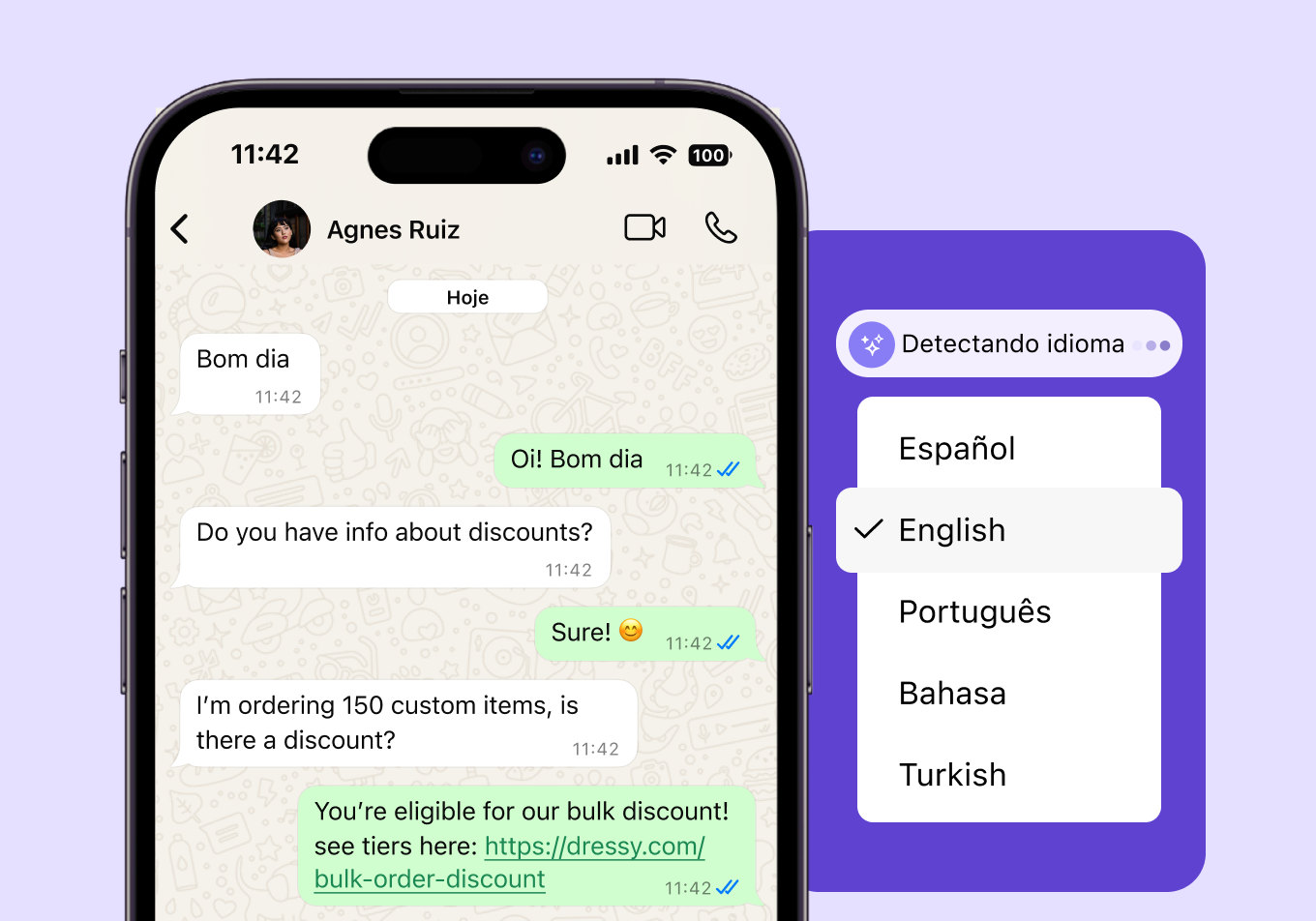 Suporte multilíngue: Detecte e responda no idioma que seus clientes usam, com respostas naturais e contextualizadas.