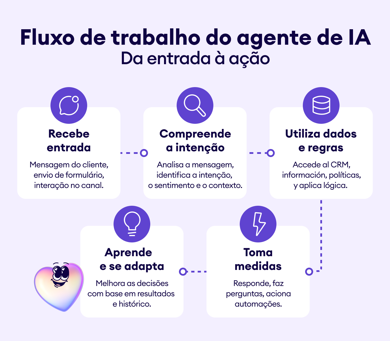 Utiliza dados e regras: Acessa fontes de dados conectadas (CRM, informações do produto, políticas) e aplica uma lógica predefinida.
