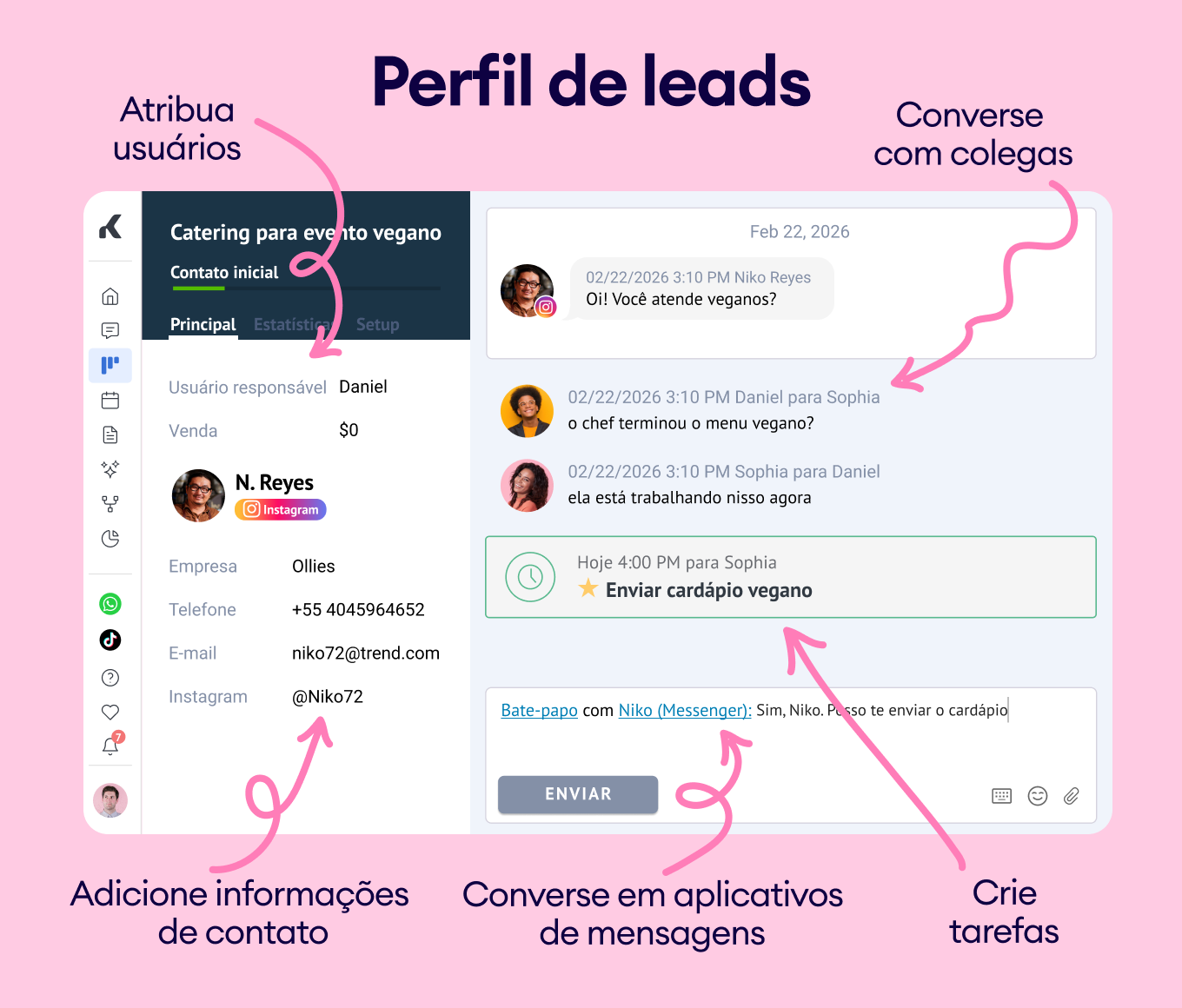É possível conversar com colegas, definir tarefas e criar lembretes diretamente no cartão de leads da Kommo, agilizando o fluxo de trabalho da equipe e garantindo que todos clientes sejam atendidos. 😎