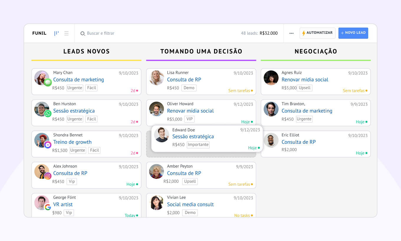 O funil digital personalizável da Kommo oferece uma visão panorâmica de todo o seu processo de vendas. Com o poder da automação, os leads passam perfeitamente do “contato inicial” para o “fechamento da venda”, para que você possa acompanhar de perto o status de cada lead.